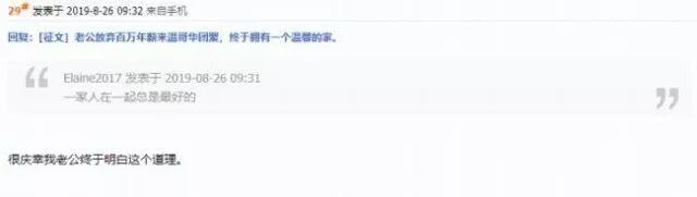 这则感人的故事发布后,评论在1个月不到的时间就超过了1000条。绝大部分的网友都认为这个丈夫的选择是对的,因为百万年薪的意义,根本比不上一个温暖的家。有不少评论,也同样很让人触动,因为和这位妈妈有相似经历的网友,不在少数: