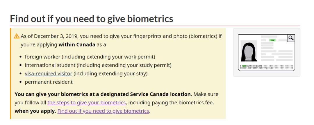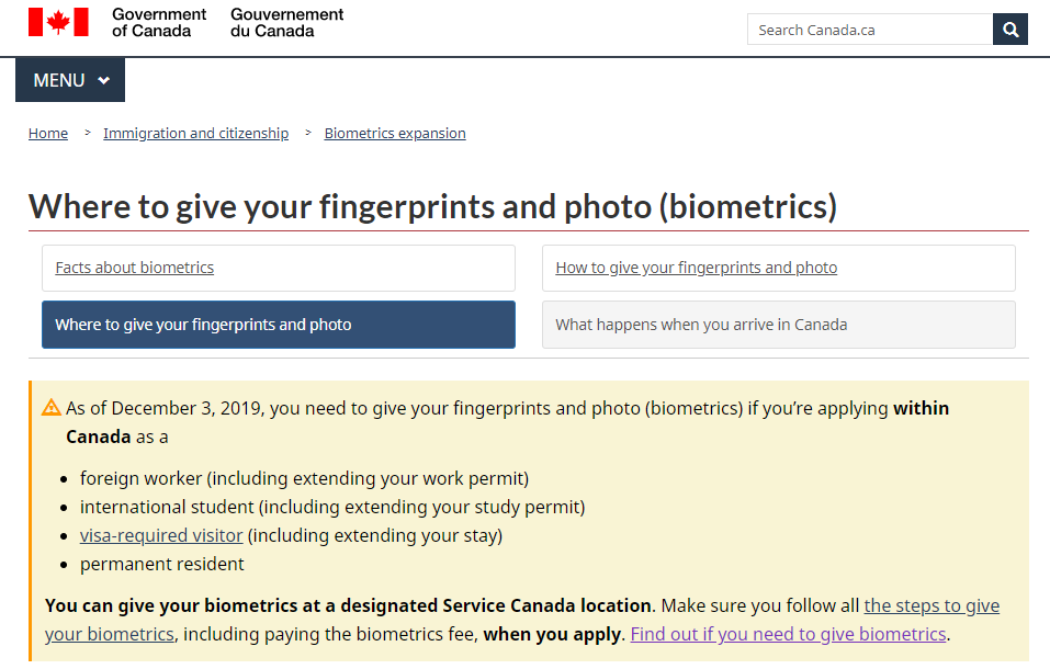 加拿大移民部今日(2019年12月3日)发出通知:即日起(2019年12月3日),在加拿大境内申请旅游签证及续签、学生签证及续签、工作签证及续签和移民的申请人要开始录指纹了!