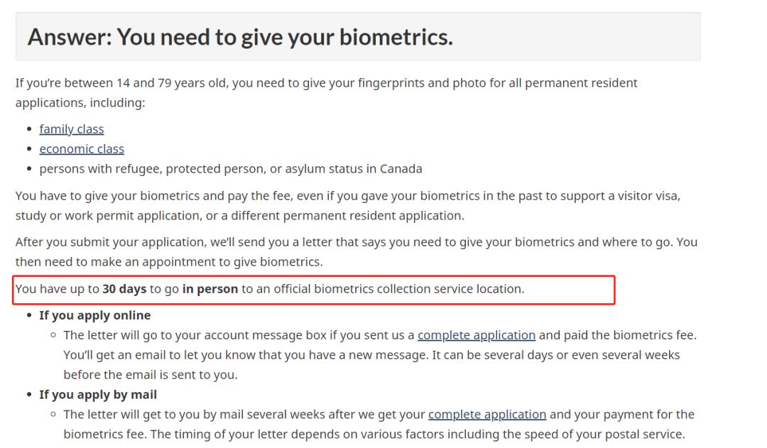 如申请人年龄在14岁至79岁,申请加拿大经济类移民、家庭团聚移民及难民,则需要在30天之内采取指纹。
